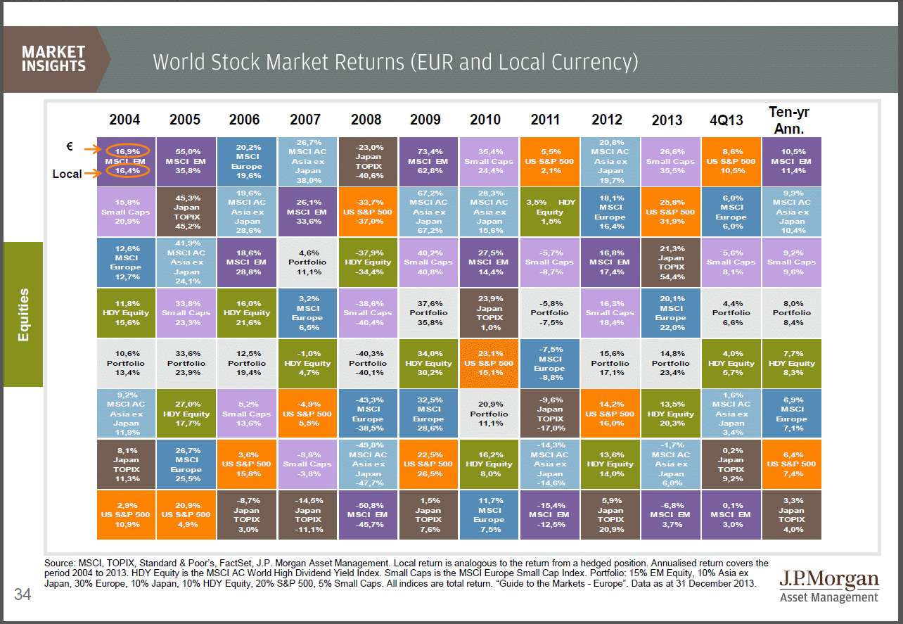 As imagens têm as performances convertidas para o EUR e para moeda local de cada região geográfica, quando possível, encontrando-se assinaladas, para o efeito. Podendo-se verificar a influência das conversões cambiais, na performance dos activos. Abaixo pode-se verificar os mercados em várias circunstâncias, em queda e em recuperação, a influência das políticas económicas dos países, das crises políticas, sociais e militares, seja na valorização ou desvalorização da moeda nacional, dos mercados accionistas e obrigacionistas, como nas matérias-primas, incluindo o ouro e o petróleo, que podem ser usados como indicadores do crescimento económico mundial.