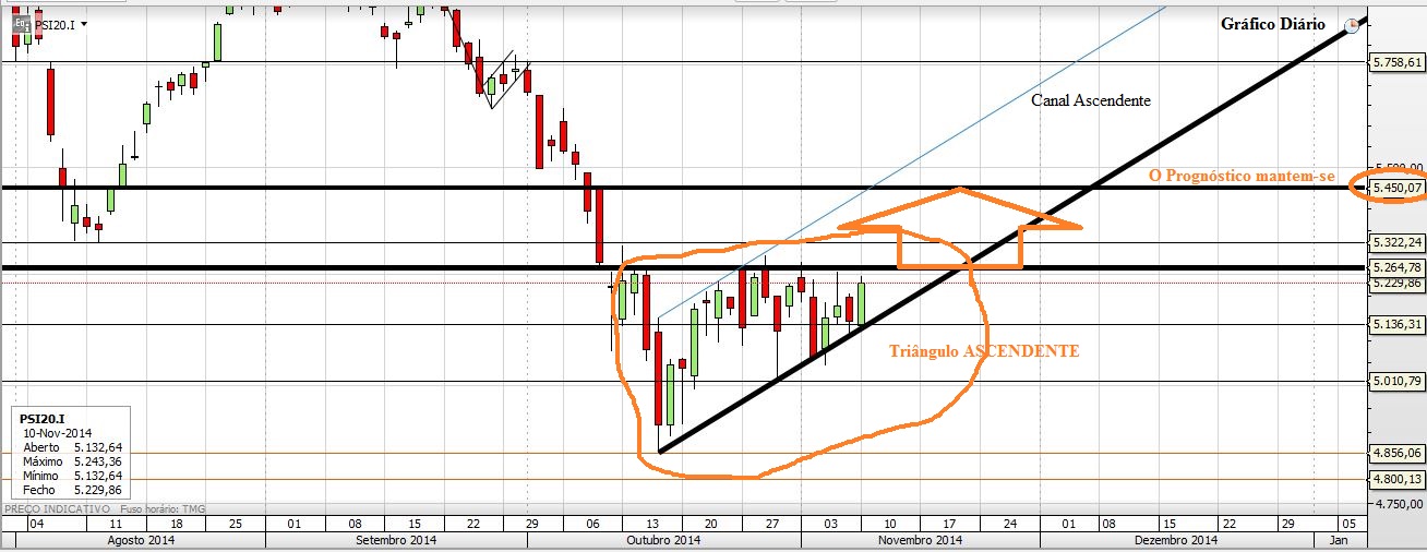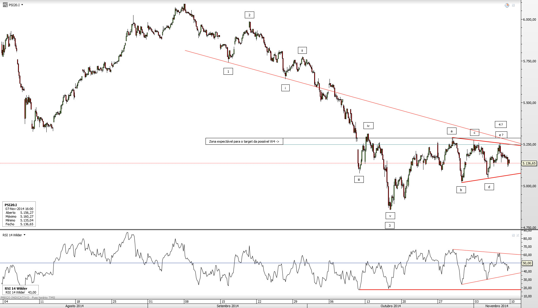 A não formação de um novo mínimo assenta na premissa de que o movimento iniciado no dia 8 de setembro terminou no dia 16 de outubro, o movimento seguinte terminado no dia 29 de outubro seja uma W1 e o movimento de hoje seja a W2. Para isso acontecer o índice não poderá descer os 4856,24 (mínimo do ano) e terá de ultrapassar os 5290,81 (linha verde horizontal).