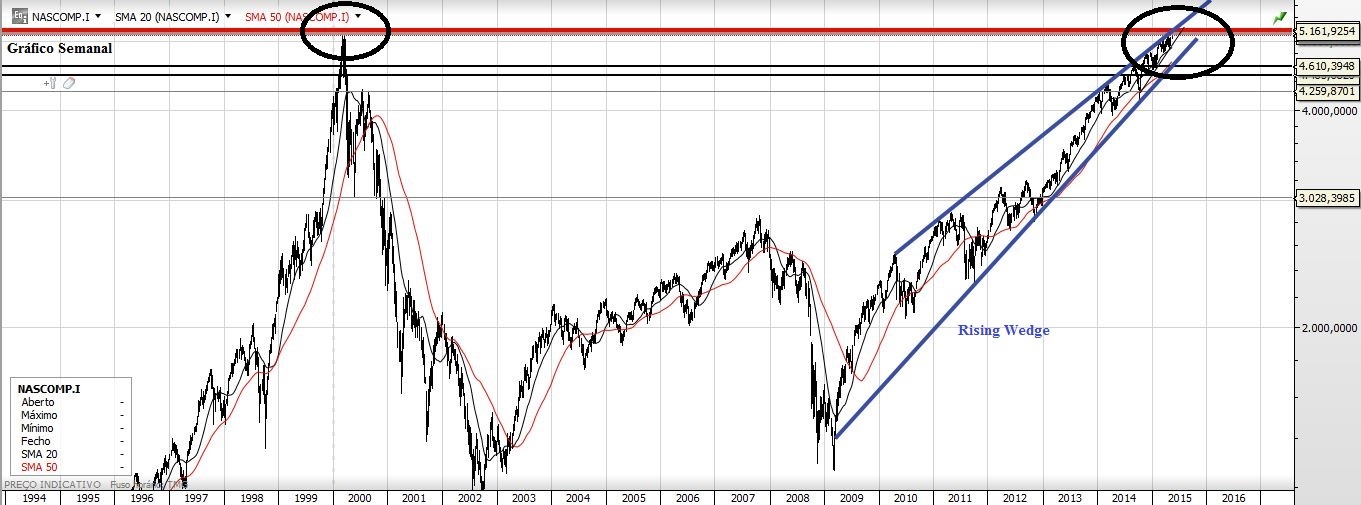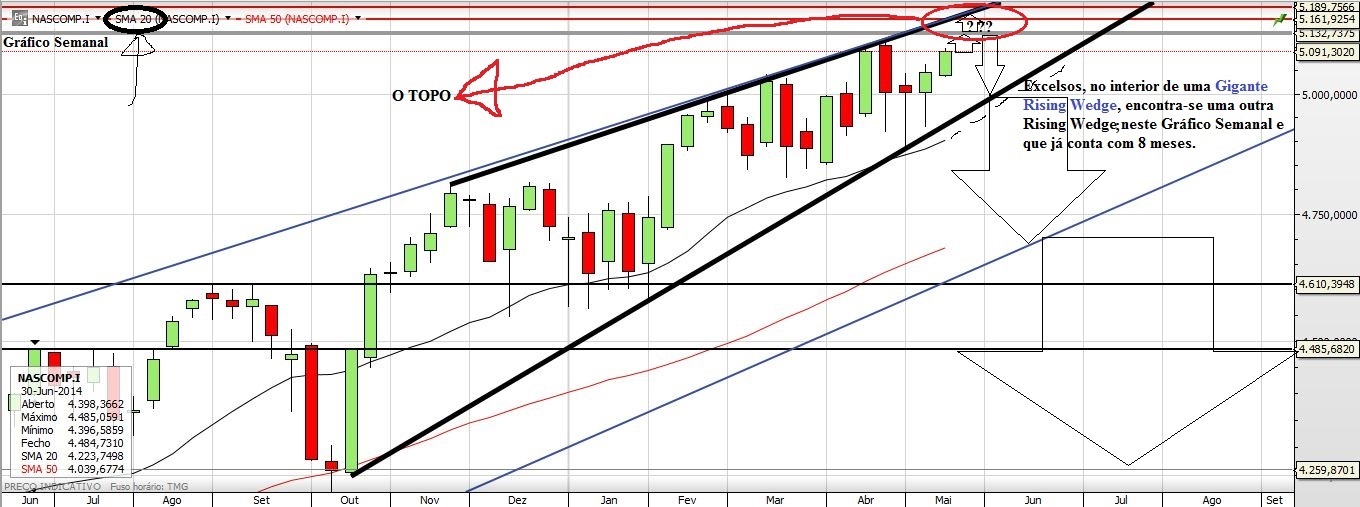 Deixo aqui os gráficos mais representativos do chamado busílis da questão; onde está o Wally? Diga-se, o Topo! É certo que encontra-lo é difícil, mas tem sempre a sua piada tentar descobri-lo, quem sabe o NASDAQ tenha essa resposta... no mínimo terá uma correção. É preciso ter em conta que a linha superior destas Wedges está a coincidir com a zona dos Máximos de sempre. Não há coincidências. (E olha um duplo topo também...)