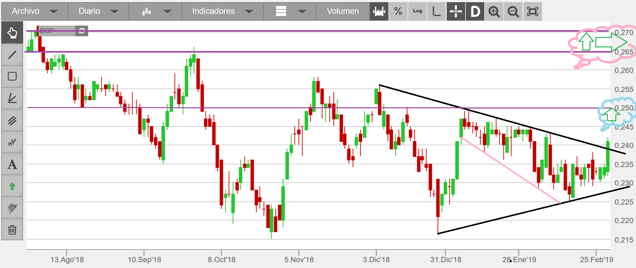 Claramente o mercado mais vendedor a refletir os novos dados apresentados pelo BCE para o medio prazo de significativo menor crescimento da economia para 2019 e taxas juro zero por mais tempo. Fechando nos 0.2333 a mim a AT diz-me que existe uma elevada possibilidade de ir testar o suporte na zona dos 0.23 e depois vemos como mercado se comporta nesse suporte .