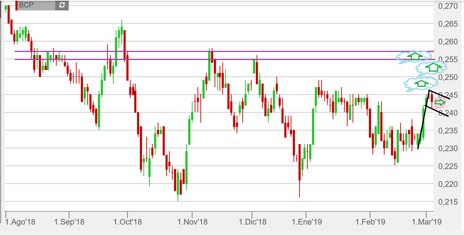 Sem prejuízo de nada daquilo que até agora disse, fiz uma análise técnica para o curtíssimo prazo. A bandeira de alta está em formação. Vamos aguardar mais umas duas sessões 3, ou 4 sabendo que sempre que o BCP for à base da bandeira os tubarões lá estarão para comprar