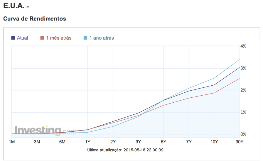 O mercado de obrigações, por sua vez, já pede mais rendimento nas obrigações com maturidades mais longas, relativamente ao mês anterior. Indicação que os investidores esperam a subida dos preços no futuro, mas a recente desvalorização das Bunds estará seguramente a pesar, também, neste movimento. Nas maturidades menores, o valor do juro é superior ao de há um ano atrás, sugere expectativa dos intervenientes na subida, pela FED, do preço do dinheiro.