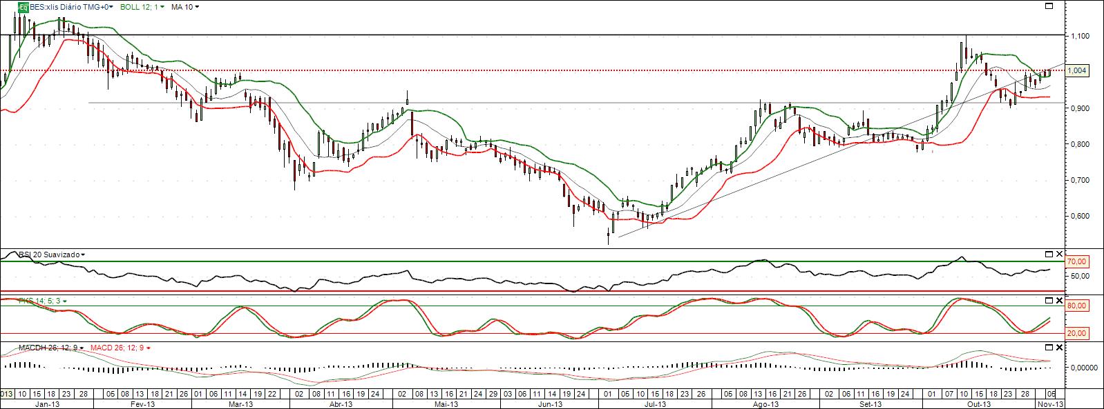 Tal como demonstra o gráfico o BES está com "boa cara". Caso passe os 1,01 (que é o ponto de inversão da linha de tendência ascendente) tem caminho aberto para chegar à próxima resistência relevante, que traço como sendo 1,10.