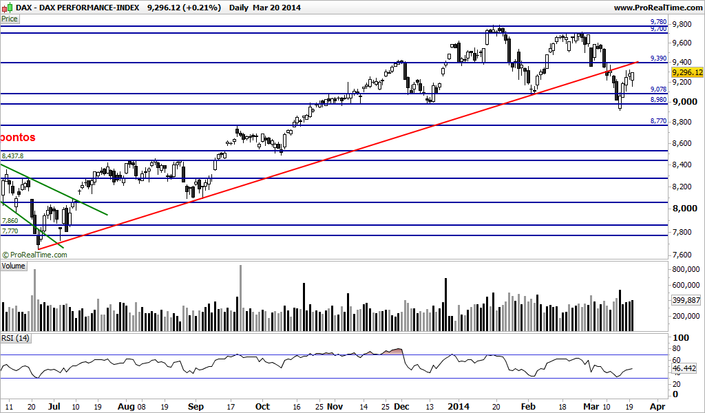 Estou portanto com uns 100 pontitos de lucro. Quando abri a posição coloquei imediatamente (com o DAX não se brinca) stop nos 9100 e limite nos 9390.