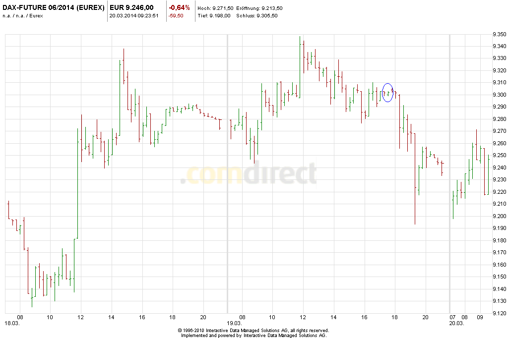 No mês de Março ou no Continuous, realmente os preços não mais voltaram a tocar nos 9300, no entanto, a diferença, está no roll-over dos contratos que ocorreu a semana passada. O DAXMAN já está em Junho enquanto o resto da malta continua em Março (CFD)