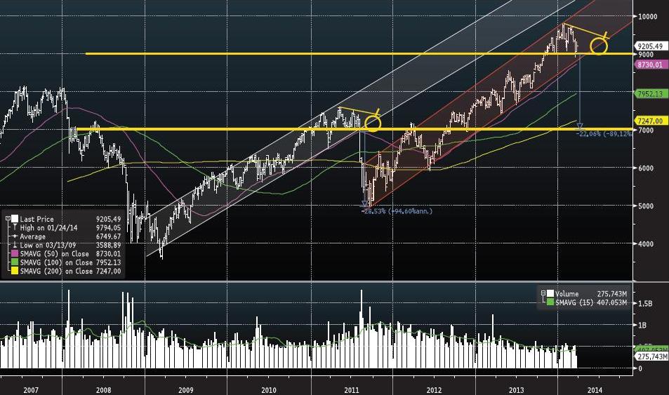 Meus amigos nao sei se estao a ver bem o historico 2009/2011 vs final 2011/2014 se temos um fecho do DAX abaixo dos 9.000 tenho um retracement semelhante que pode vir abaixo dos 7.000 se me ensinarem eu posto um grafico que tenho em ficheiro