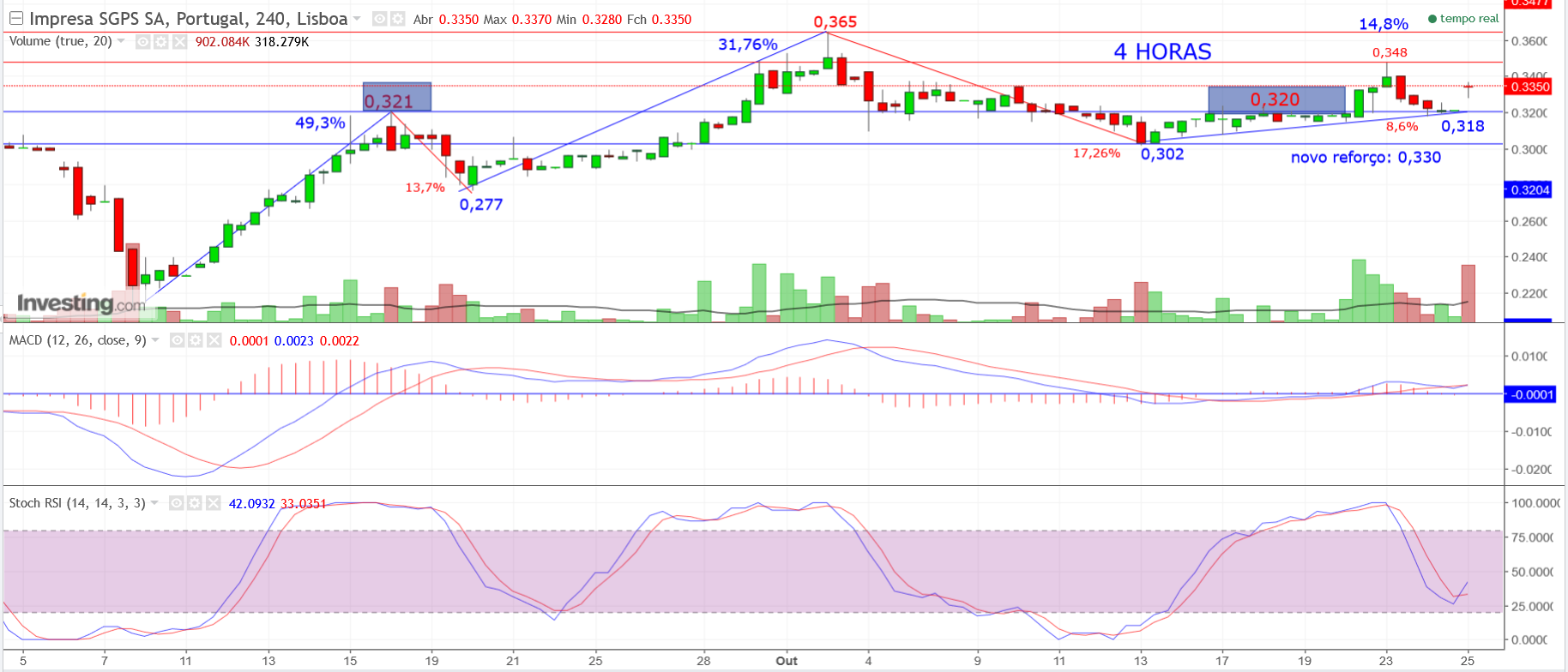 Aquela subida de 6,35% com um volume de 2,1 Milhão não foi um acaso. A mim, a queda seguinte estava a parecer-me estranha, por isso reforcei ontem e hoje voltei a fazê-lo a: 0,321(já na subida).