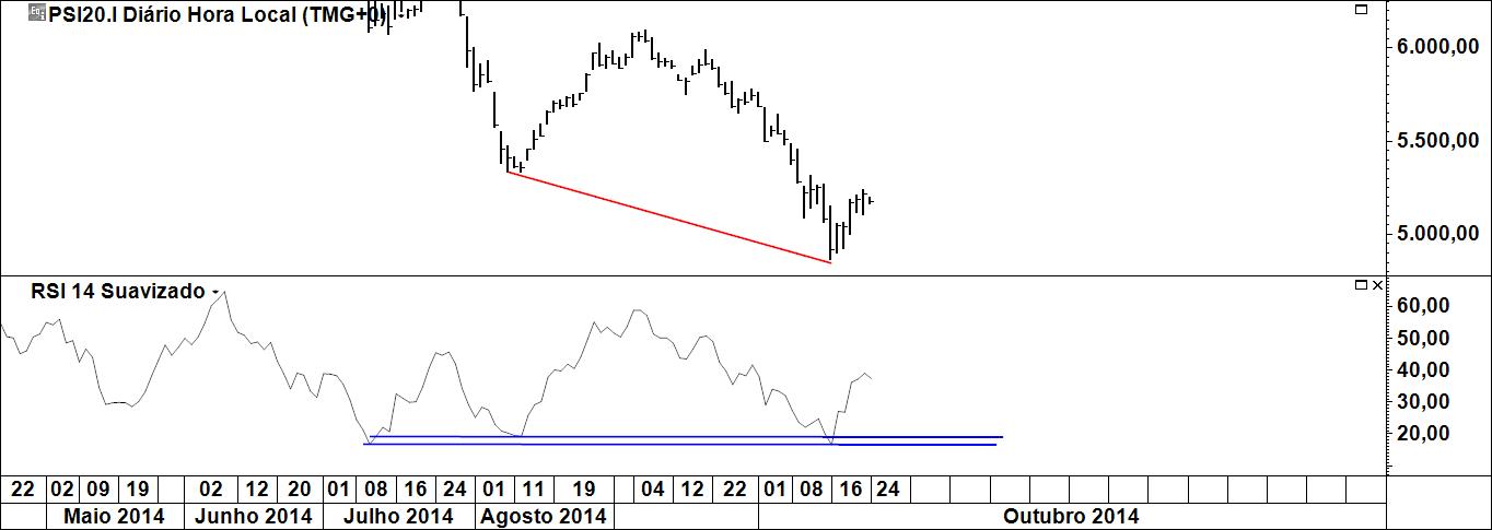Contudo, nota-se algo interessante: preço fez novo mínimo mas o rsi recusou-se a isso.