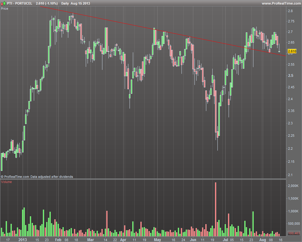 Já o caso da Portucel é bem diferente, visto estar prestes a enfrentar a zona de resistência que já por quatro vezes lhe valeu uma retracção. Pretende-se com esta abertura de posição aliar o movimento puramente especulativo à boa oportunidade técnica. Analisemos os prós e contras de um short a este título: