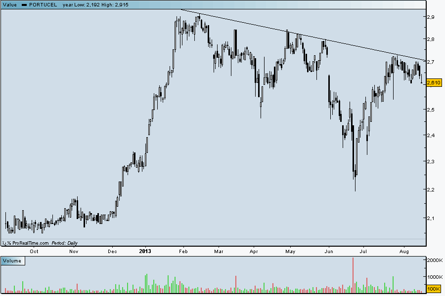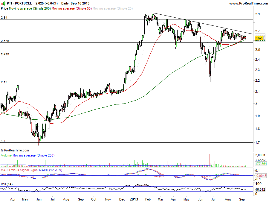 No que se refere à Portucel, uma consolidação em torno dos +/- 2,60 e uma quebra em alta dos +/- 2,72, levarão muito provavelmente a Portucel a novos máximos anuais.
