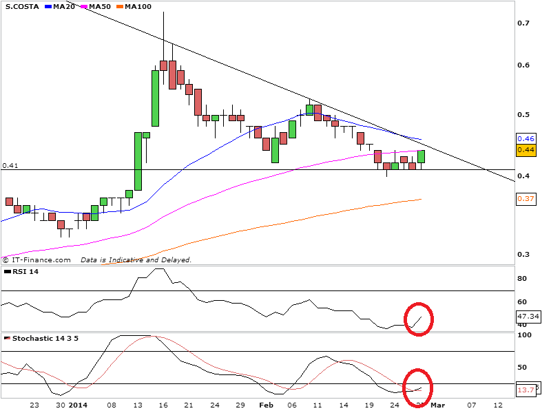 Boa noite pessoal, hora bem, eu tinha dito que compraria só nos 38 ou 32, mas penso que não vai lá chegar, ontem num dia mau para a bolsa Nacional, a Soares da Costa mostrou que o suporte entre os 40 e 41 é forte, o que me levou a comprar hoje a 42 o que tinha vendido á dias atras.