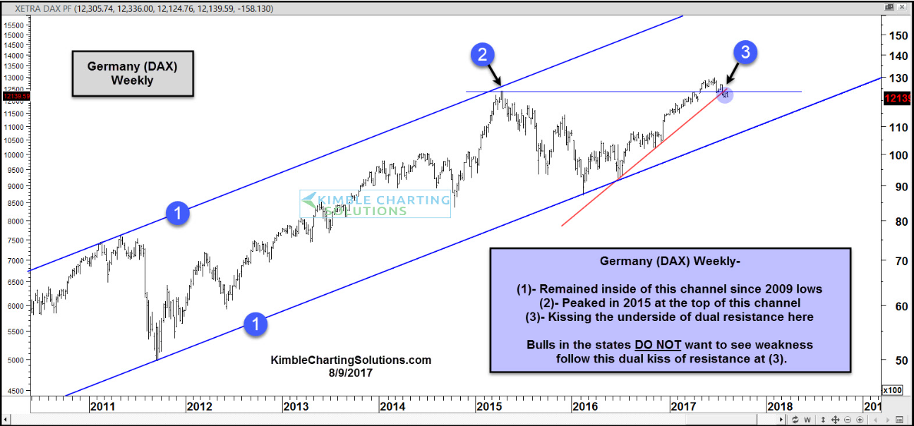 Stock markets around the world remain highly correlated. With this in mind, the German stock market finds itself potentially kissing dual resistance, that could impact stocks in the states.
