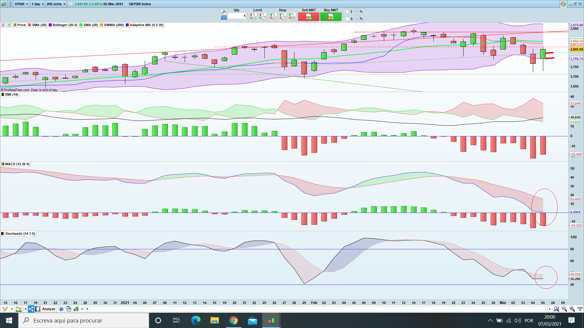 Em setembro e outubro de 2020 foram duas fases em que o SP500 fechou vários dias abaixo da EMA 72. Agora em março nunca fechou abaixo dessa média.