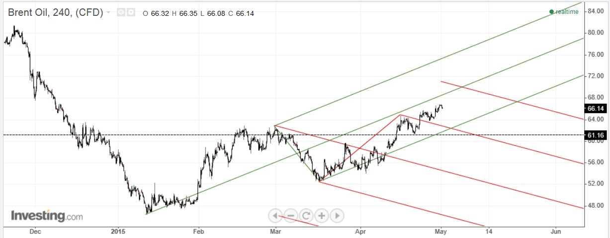 olhei também para o gráfico do brent e deixo uma questão: analisando o gráfico do brent o qual, ao invés do crude, não fez um double bottom, mas sim um higher low - formando um triângulo ascendente em zona de fundo, poder-se-ia ter "adivinhado" que a oportunidade shortista no crude estaria destinada a ser mal sucedida? para além disso o coil que ainda não havia sido ultrapassado no caso do crude, já o tinha sido no caso do brent. (deixo também as forks correspondentes no brent).