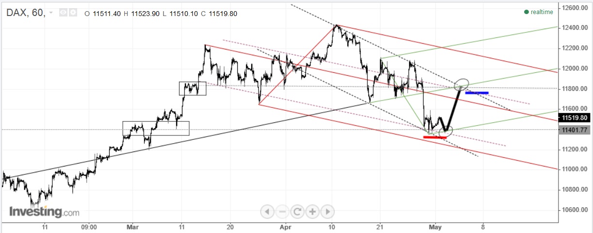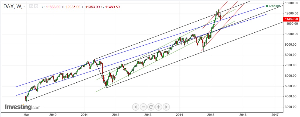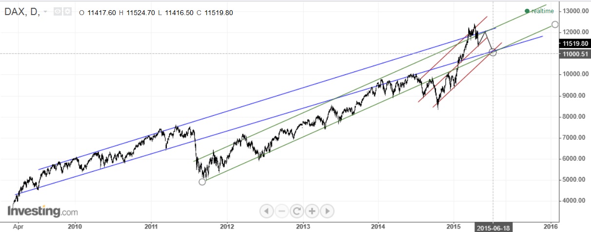 entretanto tracei estas linhas no DAX e curiosamente a intersecção das 3 linhas inferiores bate na zona dos 11000 a meio do mês de Junho. teria lógica que o preço fosse testar a intersecção das linhas superiores verde e azul para dps vir até cá abaixo à intersecção das 3.