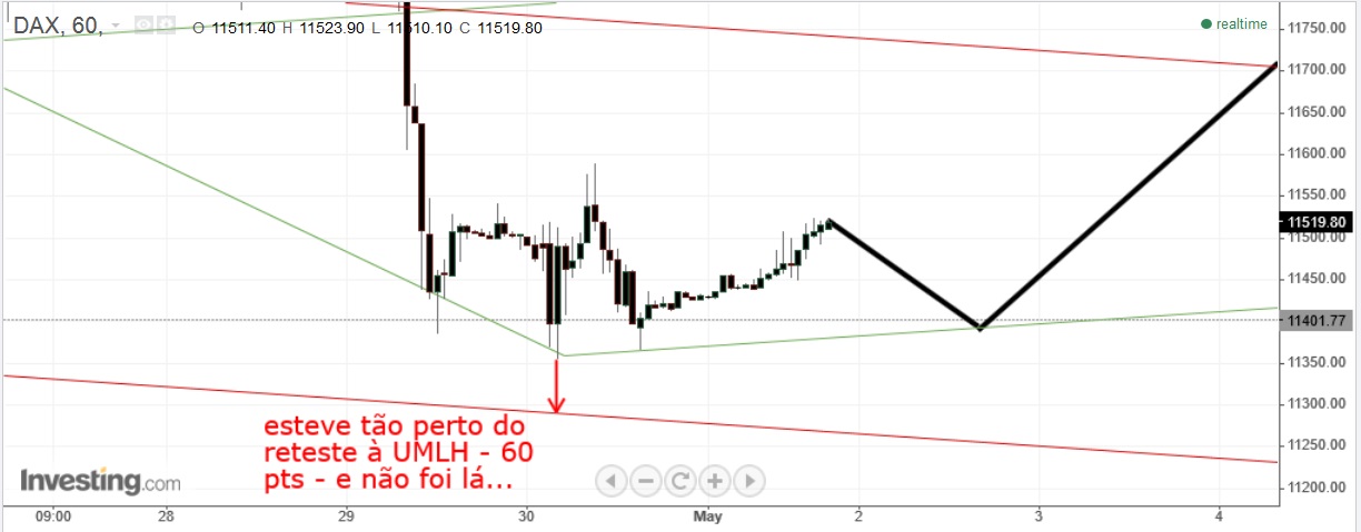 voltando ao curto prazo no DAX, deixo a ideia em anexo - compra num eventual reteste à LMLH da fork verde (confirmando-se o Hagopian em relação à UMLH da fork vermelha, o caminho deverá ser inverso - para cima, com uma amplitude igual ou superior ao movimento que o preço fez em direcção à dita linha).