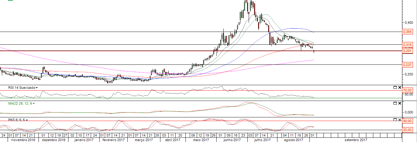 Titulo hoje em forte queda abaixo dos 0.30 e com potencial neste período para poder novamente visitar o forte suporte dos 0.17 -0.20