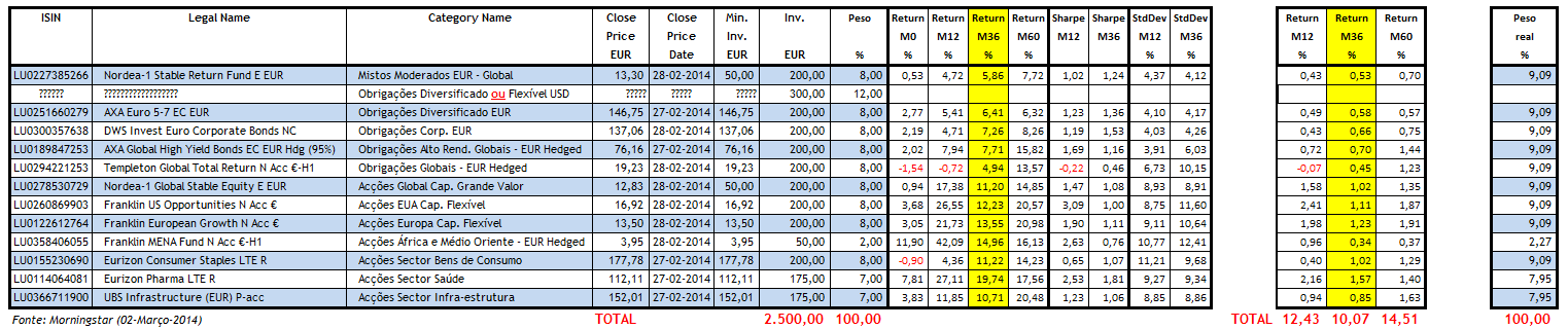 Nota: Construi a carteira baseado que preferes fundos "low cost" e por isso, "sacrificas" a carteira, ao não ter fundos de melhores performances mas exigentes em investimento.