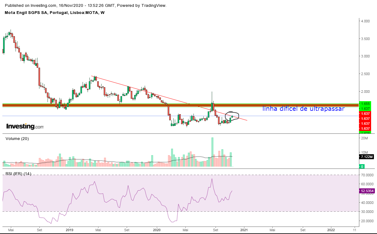 Não sei qual o destino final do movimento, até pode ir mais além...... Mas, aqui parece ser uma zona de reflexão ou retração/consolidação que se quebra em alta poderá ser tangível, numa primeira fase dirigir-se aos 1,48-1,5€.