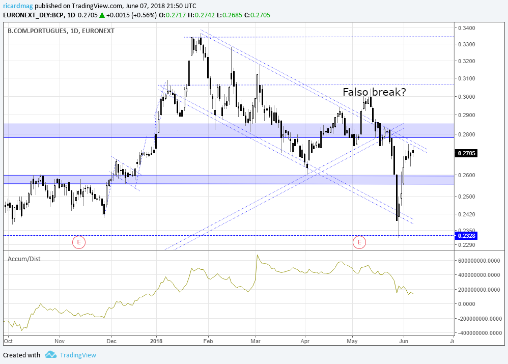 Deixo aqui o gráfico do BCP para poderem observar como a linha de tendência descendente de médio prazo travou a fantástica recuperação do papel.