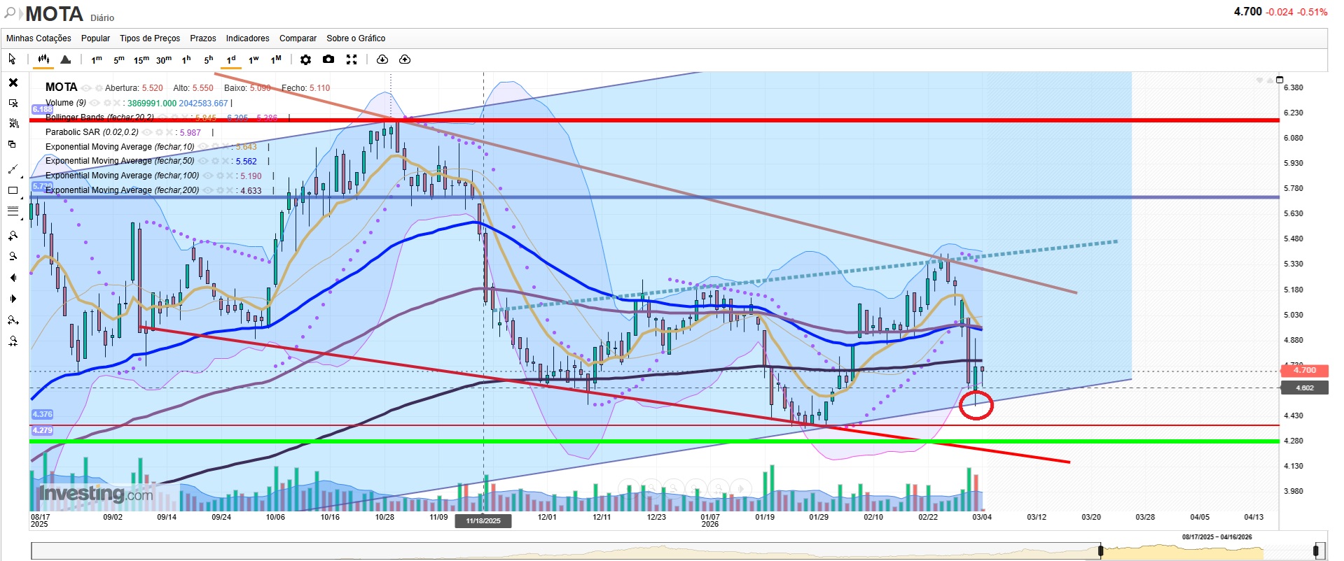 A Mota fez ontem um toque na LTA que vem de novembro de 2024, e teve uma forte reação neste primeiro toque. Decidi voltar a entrar com uma pequena posição, para ir reforçando consoante a evolução dos indicadores durante o mês de março.