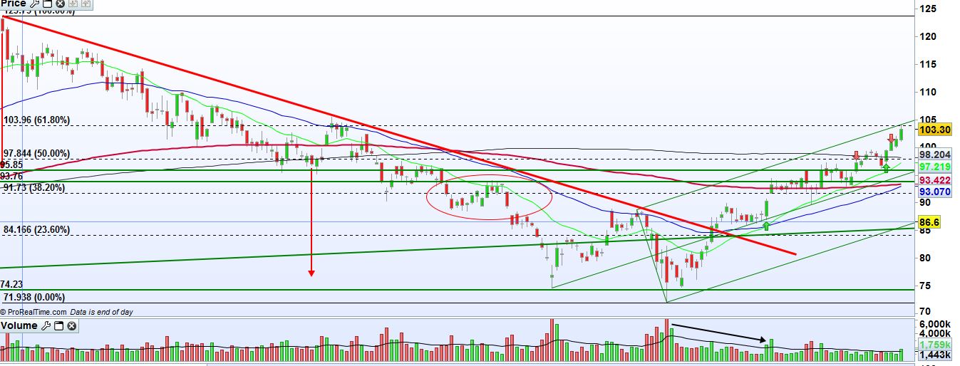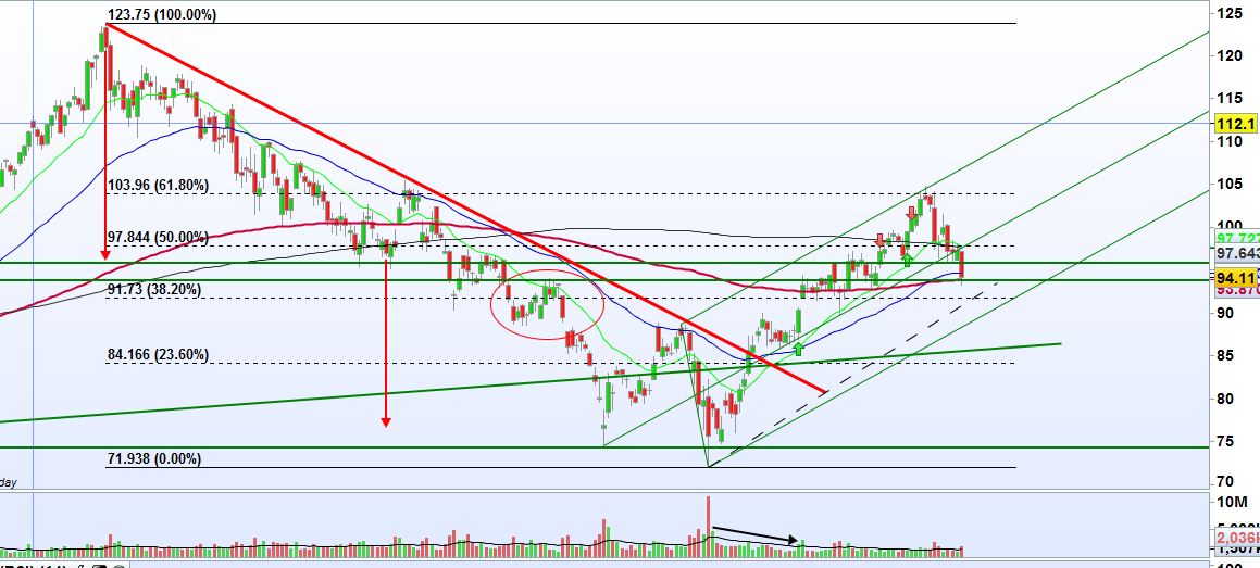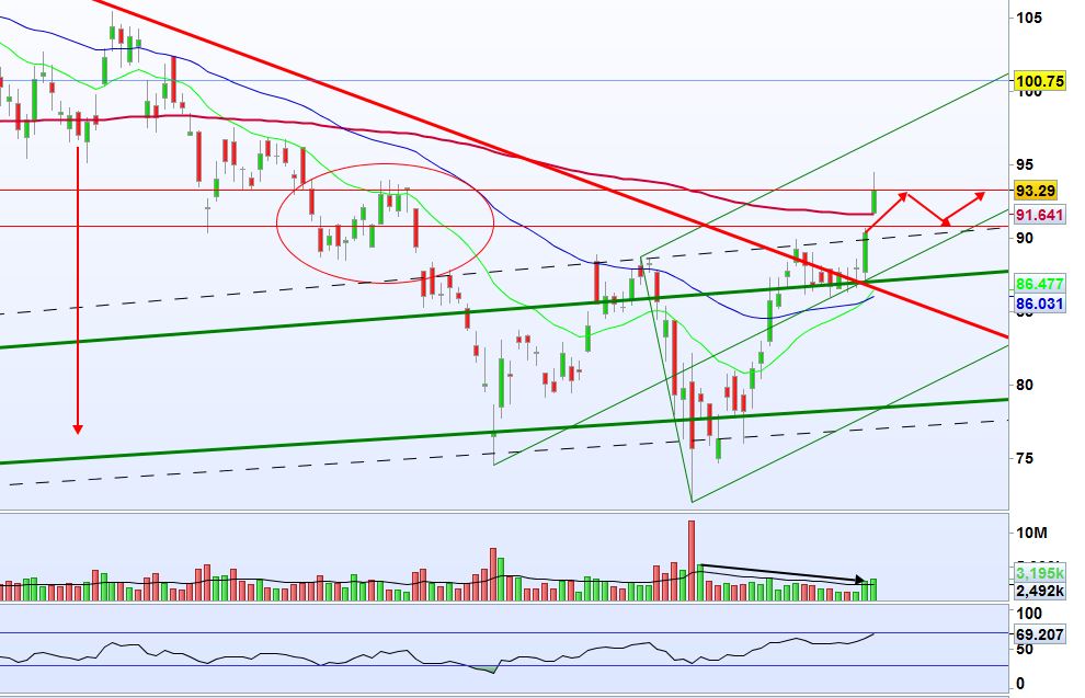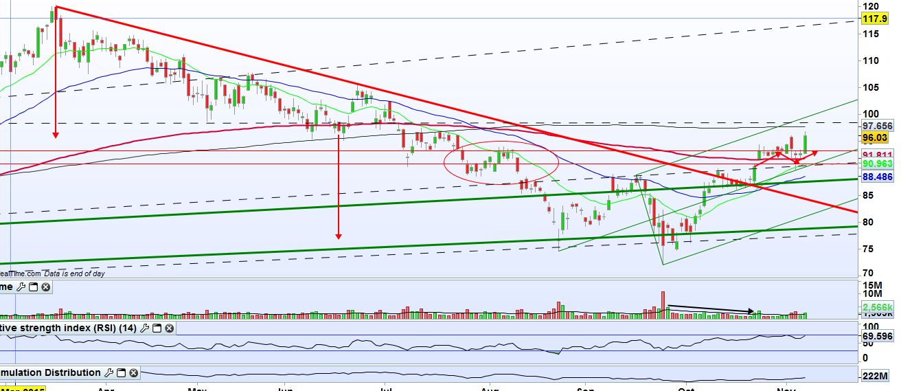 Vigiar rompimento da zona 91-94; quanto mais consolidar, mas força terá para furar os 97... vermos se isto continua....