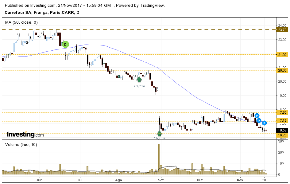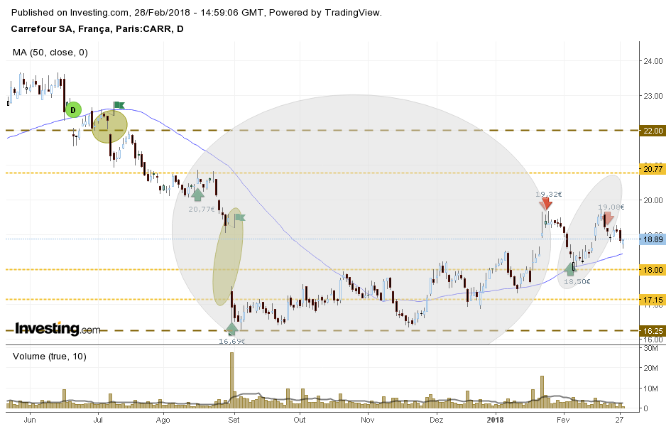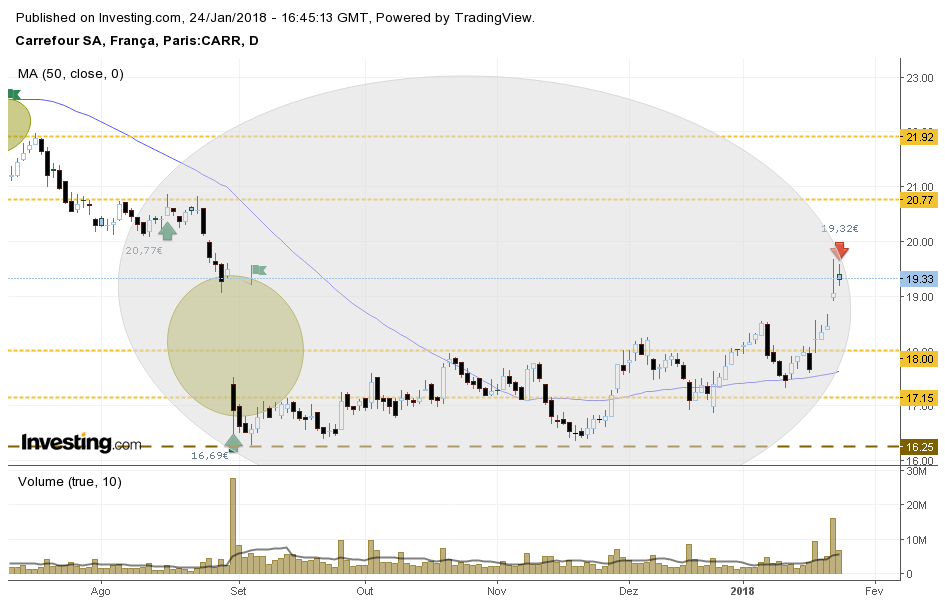 A Carrefour parece não ter força. Está a consolidar no fundo anterior recente. Tem sentido colocar um trade curto um pouco abaixo do suporte, com stop no máximo relativo anterior. O trade tem um risco de 10% se se efetivar, logo ajustar a quantidade para definir o valor de perda.