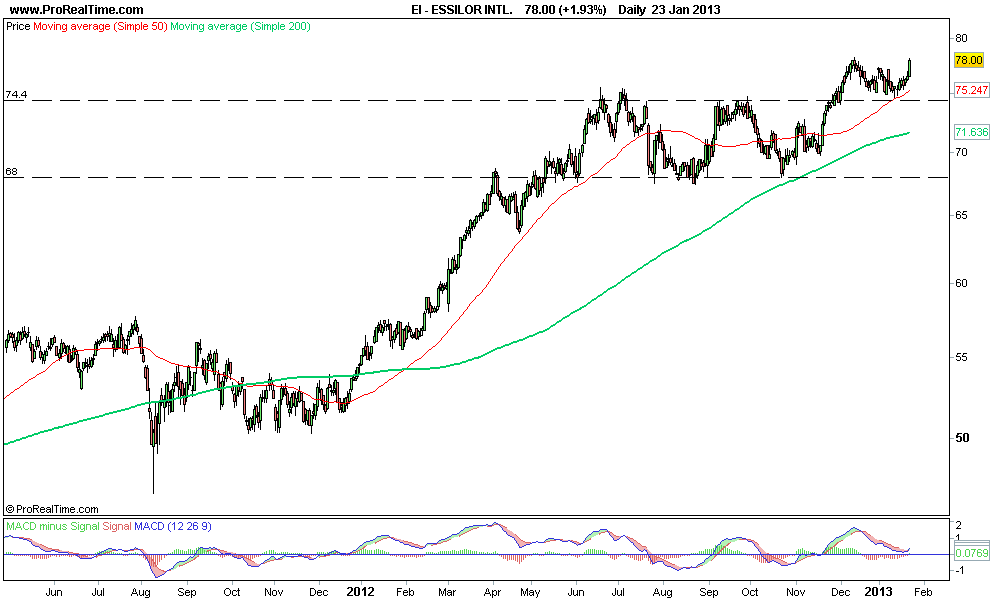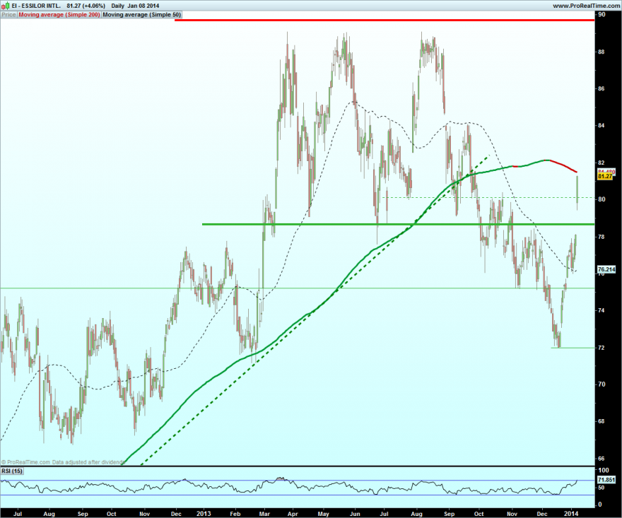 Hoje a Essilor fez novos máximos absolutos em fecho e no intraday. Fechou pela primeira vez na sua história acima dos 80 euros.