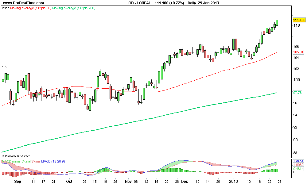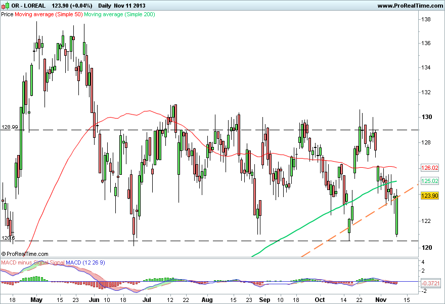 A LTA de 2012 foi definitivamente quebrada, a L'Oreal tenta agora desesperadamente manter-se acima da LTA que vem de 2011, enquanto prossegue a sua lateralização entre os 120,5 e os 129.