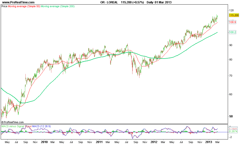 Esta semana L'Oréal cotou acima dos 90 euros, o que já não acontecia desde o princípio de 2008. Estamos portanto em máximos de 3 anos e meio. O máximo de sempre situa-se nos 99,97.