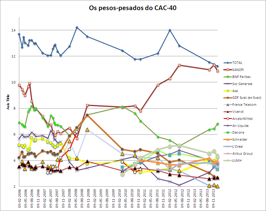Entre as acções que mais peso perderam nos últimos anos salientem-se a Orange (ex-France Telecom) e a GDF Suez.