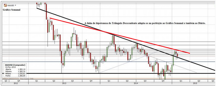 A primeira grande razão para não alterar a hipotenusa prende-se com o facto de eu ter que aceitar uma linha que me acompanha à larguíssimos meses e que tem sido, juntamente com a base do Triângulo, o meu grande guia para interpretar o movimento do Ouro. Quando percebi pela primeira vez a possibilidade do Triângulo Descendente desenhei várias hipóteses de hipotenusas mas, no final, e com o tempo, optei por esta que se tem mantido até hoje. Não alterá-la ou não escolher outra agora tem a ver com uma questão de fidelidade à figura original. Não se trata de teimosia, mas simplesmente depois de ter uma figura durante tanto tempo e me guiar por ela não posso simplesmente alterá-la. Repare na vela do dia 16 de Janeiro, não é lindo ela ter tocado quase milimetricamente na linha e depois quebrado em alta a mesma? Até esse momento não haveria duvidas. Agora o Preço anda a massacrar a linha, mas ela está-se a aguentar... a linha está a funcionar. Caso o Preço volte a entrar novamente para dentro do Triângulo a conclusão que retirarei é simples: O triângulo não funcionou como figura no sentido de projectar o Preço para um determinado patamar, mas funcionou para me balizar dentro das linhas que o compõe e ai, não me posso queixar.