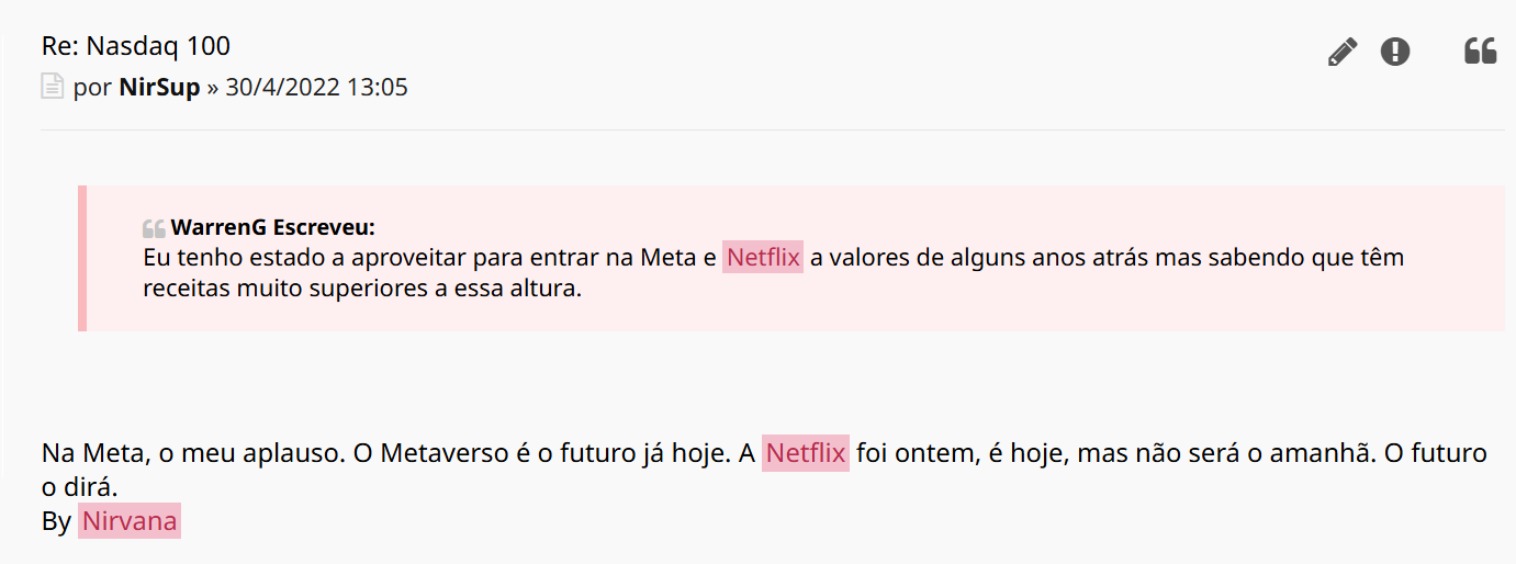 NirSup Escreveu:O que escrevi, em 2022, sobre a NETFLIX mantenho e reitero IPSIS VERBIS. É muito difícil mudar a minha opinião sobre investimentos, nomeadamente investimentos a longo prazo.