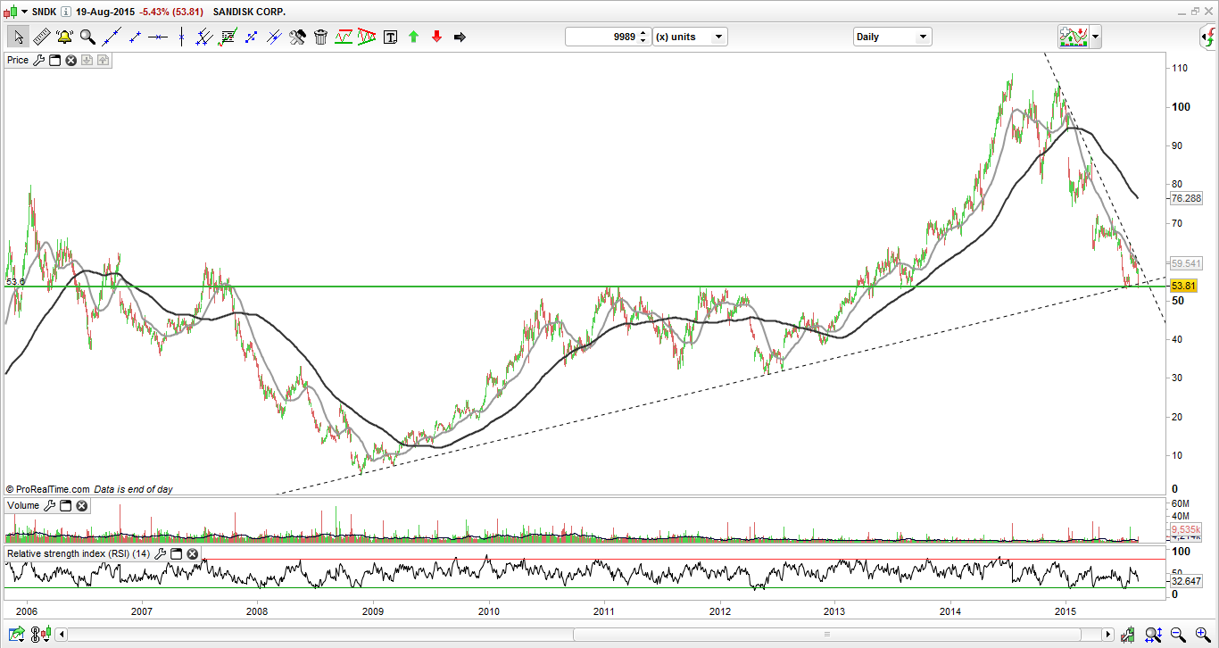 No gráfico de longo prazo podemos observar que o bull market da SanDisk tem uma LTA já com um ano e meio de vida, testada várias vezes, alguma das quais parecendo dar sinais de quebra, mas o certo é que ela tem resistido sempre.