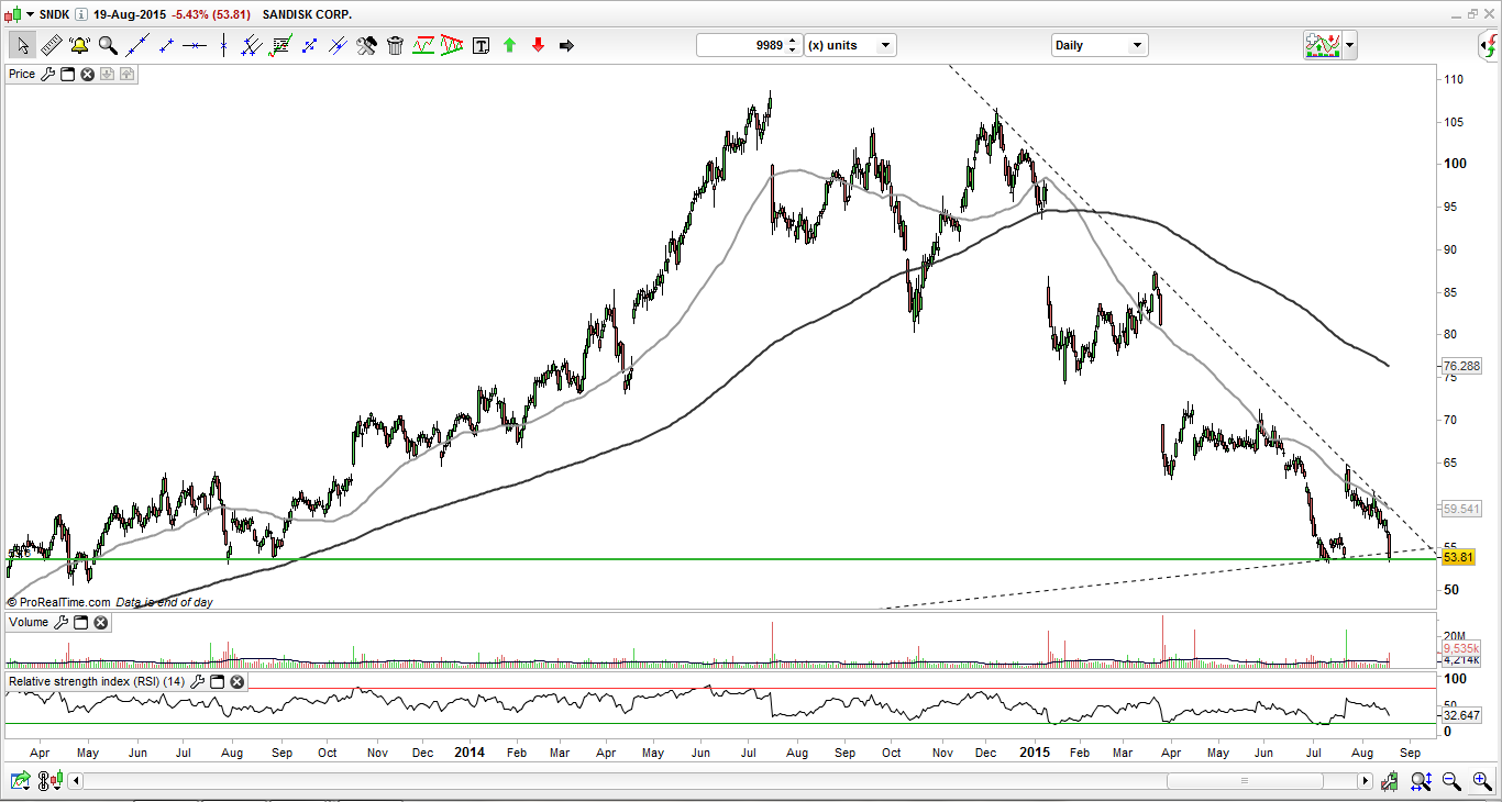 Mas reformulando o que disse: era possível que não vendesse já sandisk. É notória a forte correlação de preços, e a Sandisk pode muito bem estar a lateralizar também. Não está numa situação clara de "lower highs, lower lows". Penso que a quebra da zona dos 40-42 dollars em baixa (significativa) é um sinal descendente bastante importante (por onde andou em Abril e Maio).