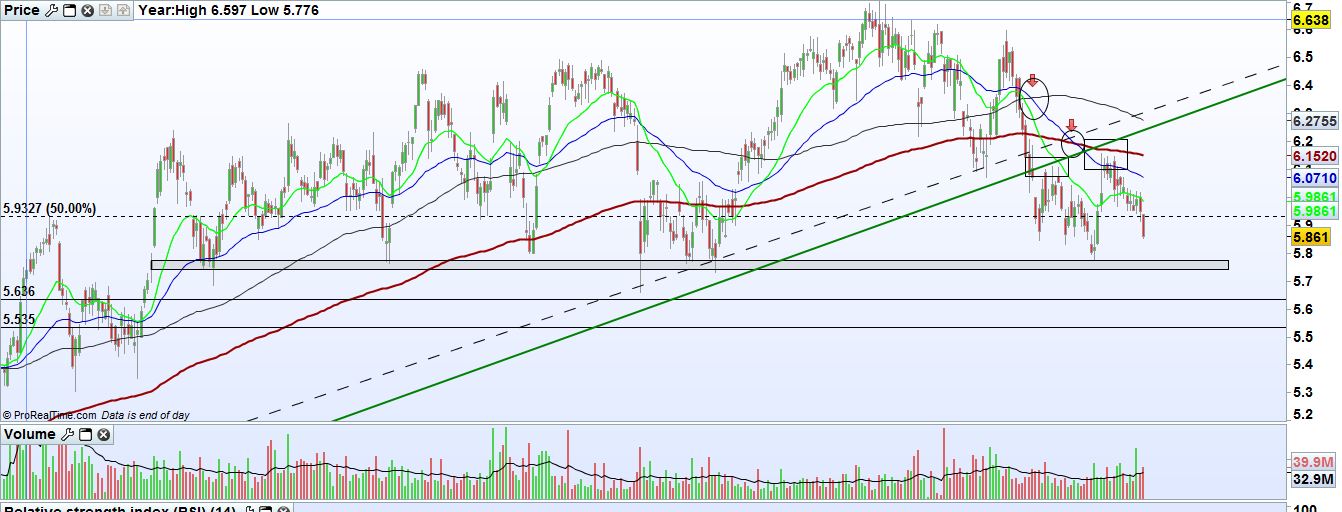 Esta menina pouco falada por aqui, vive um bull market desde julho de 2012, acerca de 1 ano tem vindo a lateralizar entre os 5.80 e os 6.5, aproxima-se novamente da zona dos 5.80, será um bom ponto de entrada? esta é a minha duvida mas estou tentado a entrar pois sempre que se aproximou desta zona reagiu sempre muito bem. Gostaria de ouvir mais opiniões.