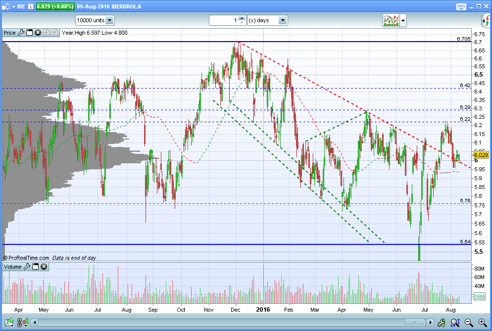 Em termos de longo prazo a tendência da Iberdrola é claramente descendente, num movimento que se iniciou em Novembro de 2007 (quando o título chegou a passar os 12 euros). No entanto, olhando para o primeiro gráfico, que está em velas semanais, podemos notar a existência de um importante suporte nos 4,5 que corresponde aos mínimos de Março de 2009 e Julho de 2010. Ainda é cedo para falar de duplo fundo mas este suporte deve ser tido em conta. Quanto a resistência, a mais importante situa-se nos 6,85 sendo esta a grande barreira que os touros terão de derrubar para que a Iberdrola possa voltar às subidas sustentadas.