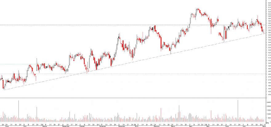 mas a situação mais interessante é que a acção se encontra num ponto de confluência de várias ocorrências técnicas: uma lateralização que aparenta ter rompido em alta, a eventual quebra de uma zona de resistência e também o ataque a uma linha de tendência descendente (ocorrências estas acompanhadas por aumento claro do volume)