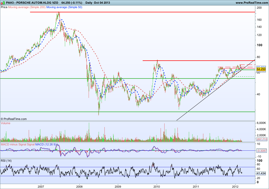 A Porsche segue em máximos de quase 3 anos. Poderá encontrar algumas dificuldades na zona dos 75 (pico de Janeiro de 2011).