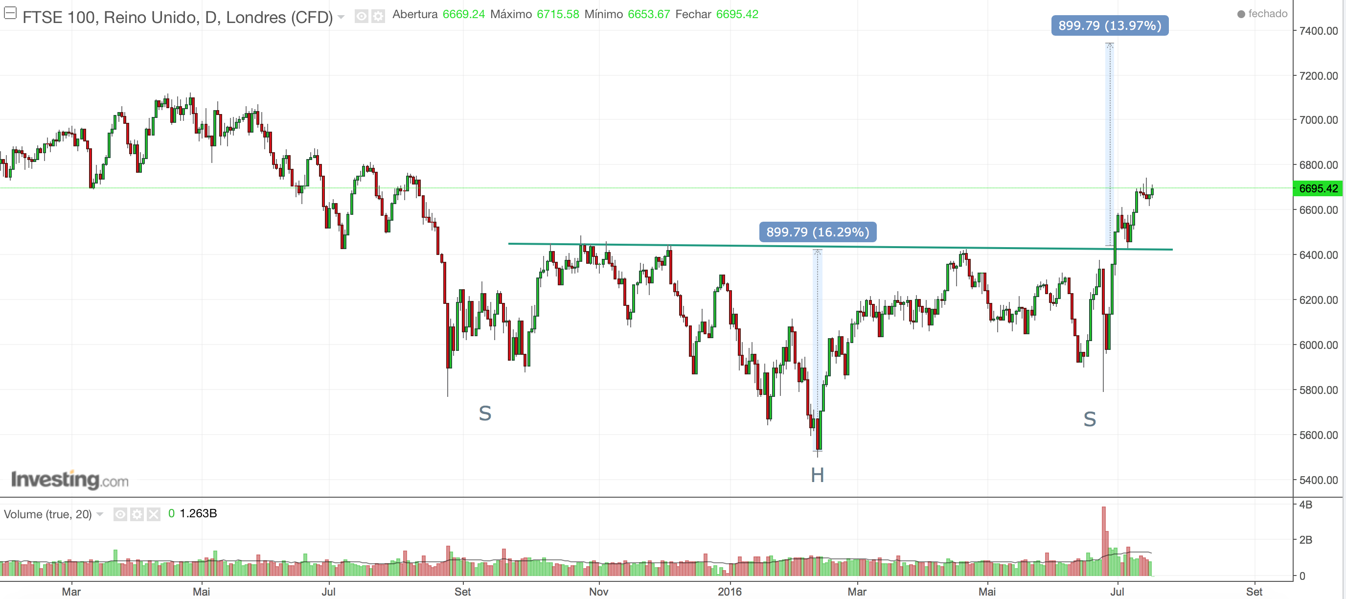 podemos ter aqui um head & shoulders no FTSE100, cuja linha de pescoço já foi testada e aguentou, seguindo-se as subidas. Target zona dos 7300.