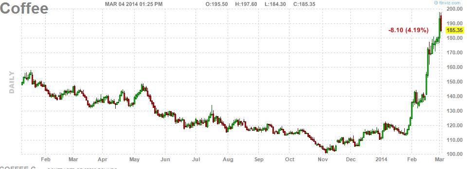 se o café está alto, parece-me que as empresas como a starbucks sofrem com isso em vez de beneficiar. Na pratica estao a comprar a materia prima mais cara. o preço do grao de café aumentou 70% desde o fim do ano 2013, mas esse aumento é absorvido pelas empresas e nao passa para o mercado na mesma proporção, alias, o preço de 1 café está o mesmo... pelo menos este é a leitura que faço.