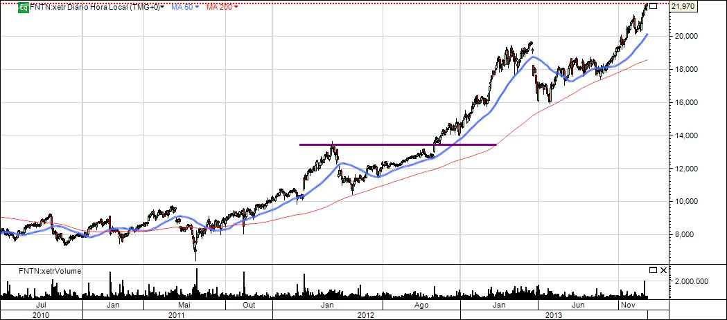 e o gráfico está cada vez mais bem composto. Movimentos com pouco ruído, esta cotada do TechDax apresente um perfil tecnico muito interessante e já segue há mais de um ano acima da média movel semanal de 40. O que parece estar para continuar. Muito boa trend.