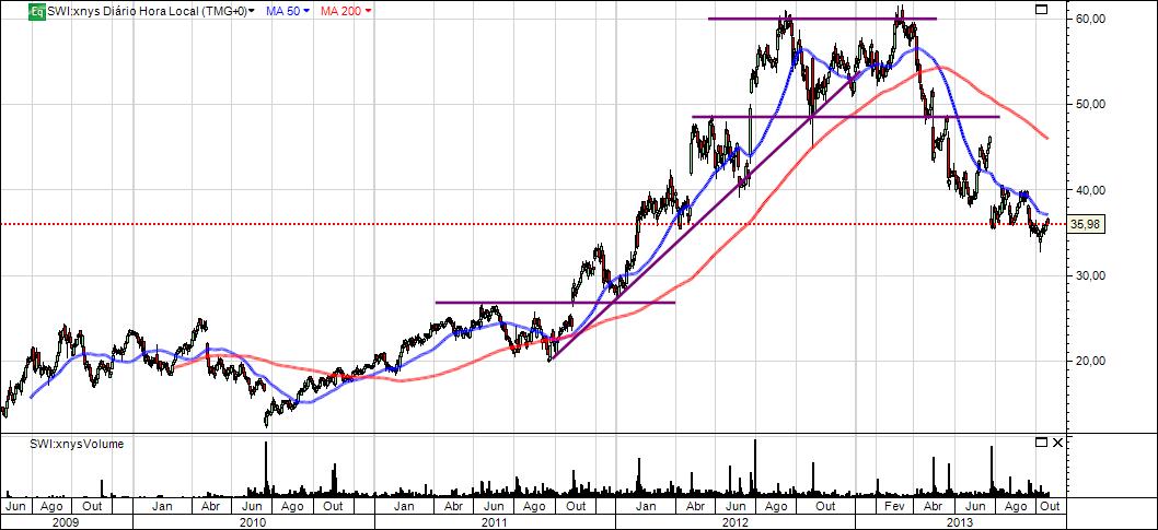 Há mais de um ano que a SWI não fecha a semana abaixo da MA40. Perfil bastante bull. Neste momento está na batalha por novo máximos ao tentar quebrar em alta a resistencia dos 60$. Os últimos meses têm sido de lateralização depois de um ano de 2012 bastante bom para a cotada.