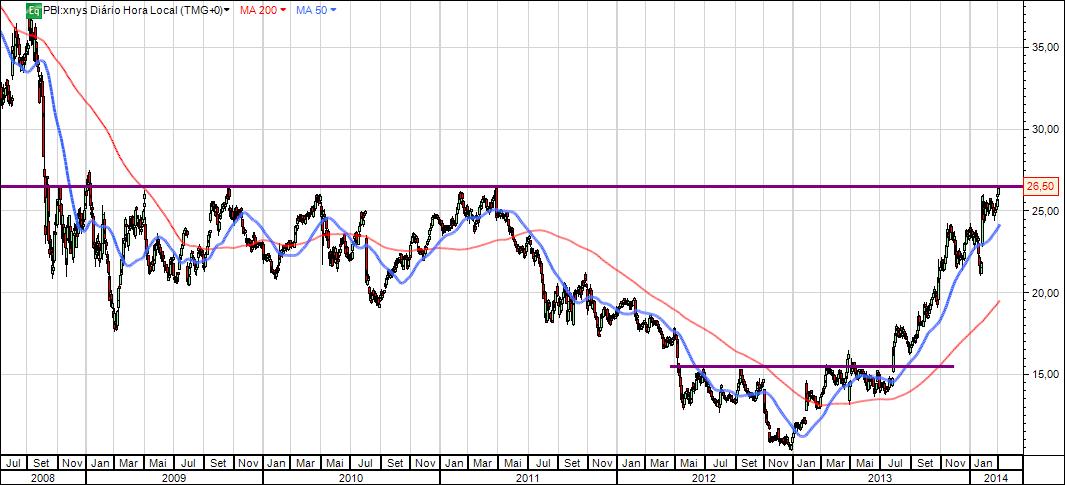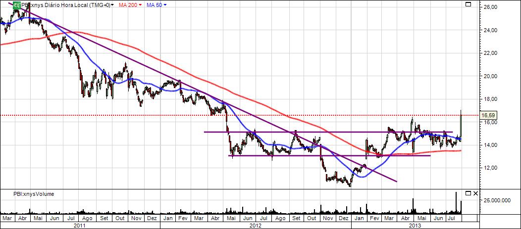 AxeRiver Escreveu:Em Janeiro deste ano a PBI quebrou em alta a LTD que definia a tendencia desde 2011, e encontra-se agora junto da resistencia na zona dos 15,25$. Este é o valor que tem impedido o título de rumar a norte desde Maio 2012. Será que à 3ª é de vez?