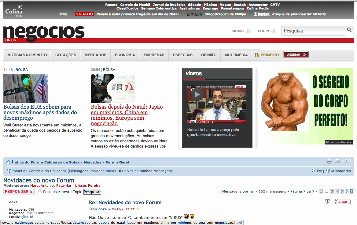 Em relação ao resto, não posso dizer nada. A publicidade como sabem e já dissemos inúmeras vezes não é da nossa responsabilidade nem gerida por nós, mas pelo Negócios. Nós só "agimos" quando algo muito intrusivo está a interferir com o Forum, o resto como devem compreender é a gestão que o Negócios faz da publicidade. Uma terá melhor gosto outra pior (e sim, estas publicidades dependem do perfil do utilizador, como de resto é corrente hoje em dia, portanto nem todos vão ver os mesmos banners).