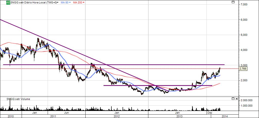 Agora a cotar acima das duas MM de referência, e depois de um ano 2013 muito "lateral", estou cautelosamente bullish de médio prazo.
