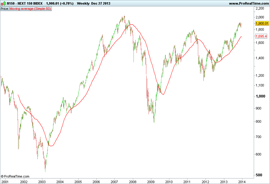 Comentário: a análise da evolução entre picos e fundos de longo prazo dá-nos indicações sobre a tendência de muito longo prazo; neste caso observamos duas tendências distintas: o EURONEXT 100 está numa tendência lateral de muito longo prazo, oscilando entre os 425 e os 1100 pontos e neste momento está um pouco acima do meio desse intervalo; o NEXT 150 está numa tendência ascendente de muito longo prazo, visível nos fundos cada vez mais altos, e neste momento está perto dos máximos absolutos. Globalmente o NEXT 150 apresenta uma evolução mais favorável.