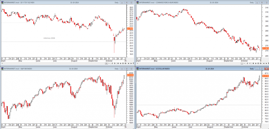no sentido dos ponteiros do relógio, temos as yields norte-americanas a 10 anos, o índice norte-americano das mercadorias, o dollar index e o S&P 500