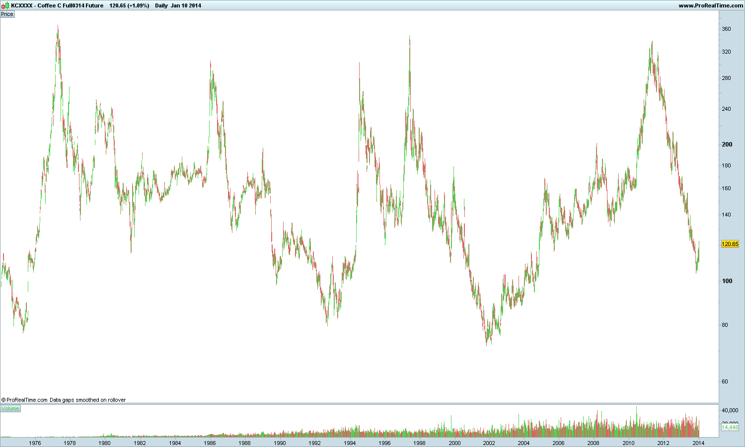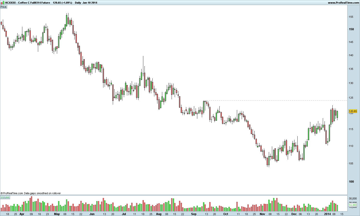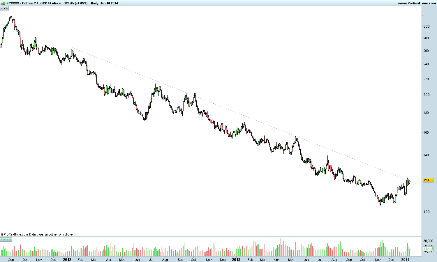 se o café fizer um higher high (vencer aquela pequena resistência no gráfico) e depois conseguir fazer um higher low, podemos falar de inversão da tendência