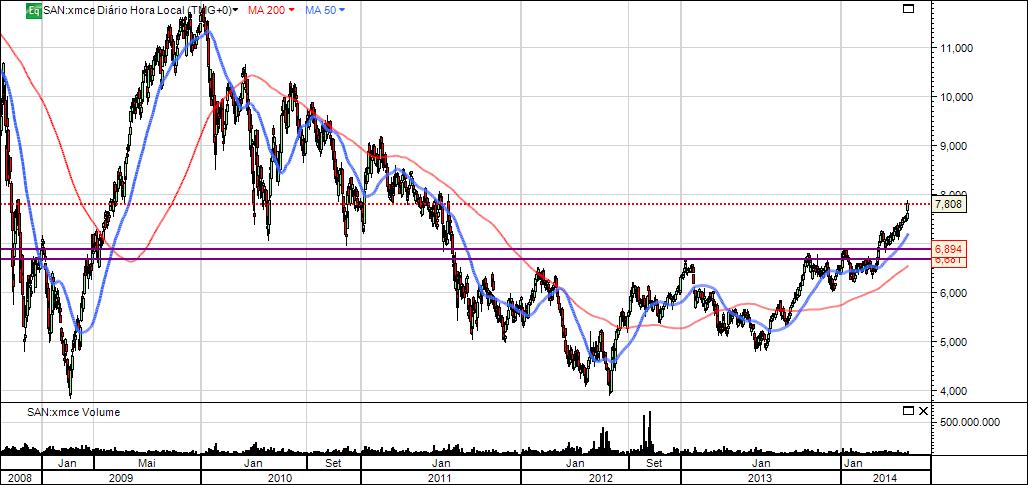 São fases do Santander totalmente diferentes. Em Abr/2013 O Santander estava em queda desde o início do ano enquanto que agora está em fase ascendente desde o dividendo de Julho de 2013.